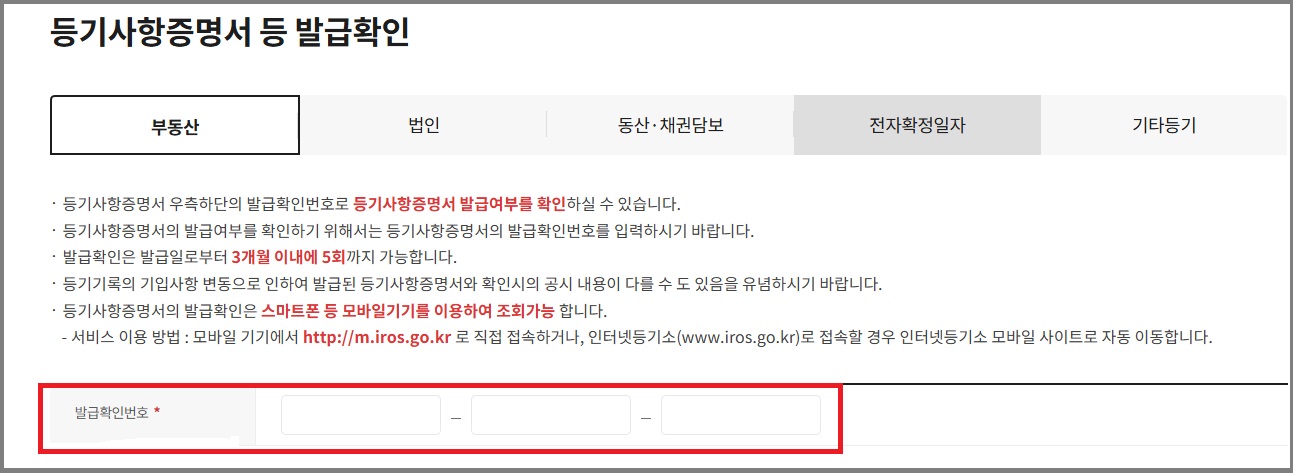인터넷등기소 진위확인 페이지 접속 → '등기사항증명서 진위확인' 메뉴에서 문서번호 입력